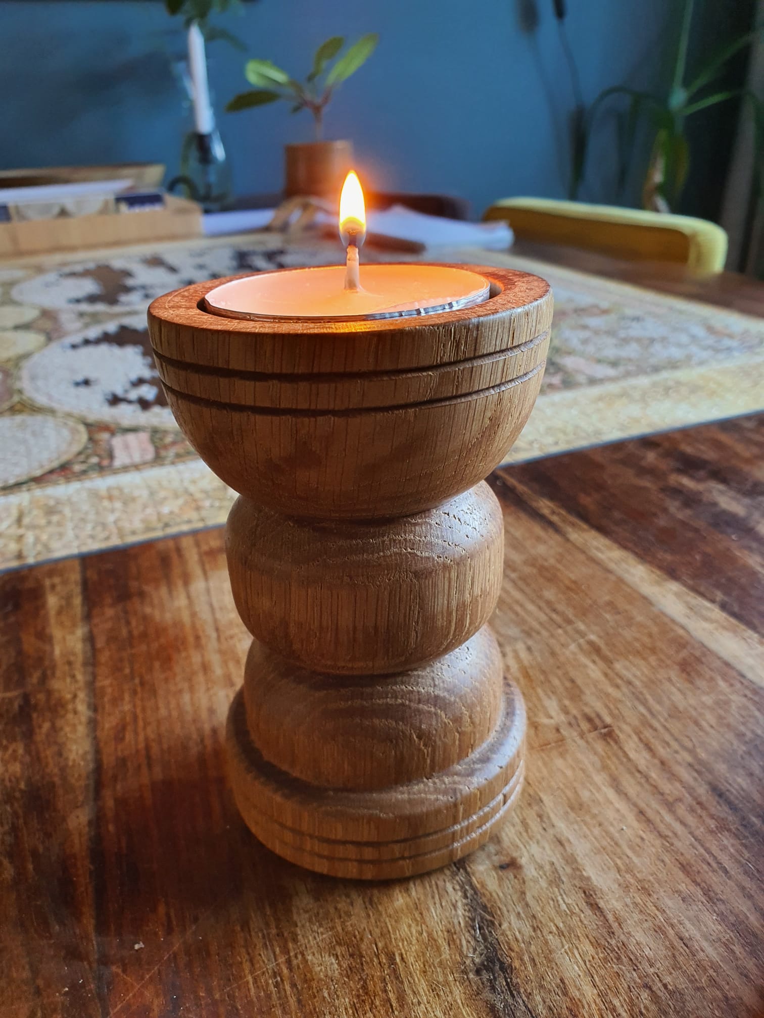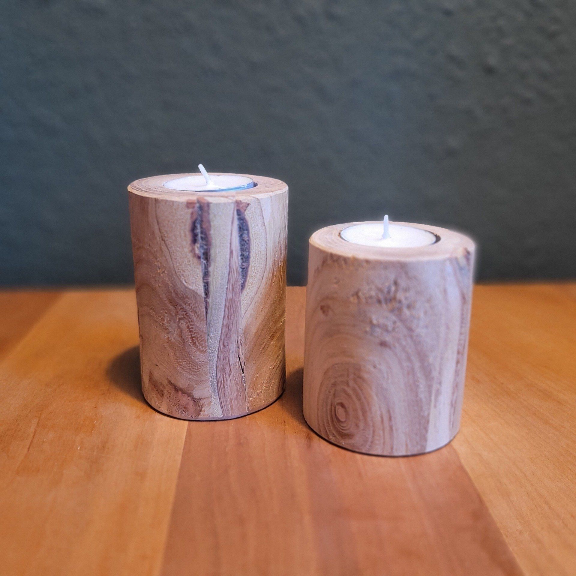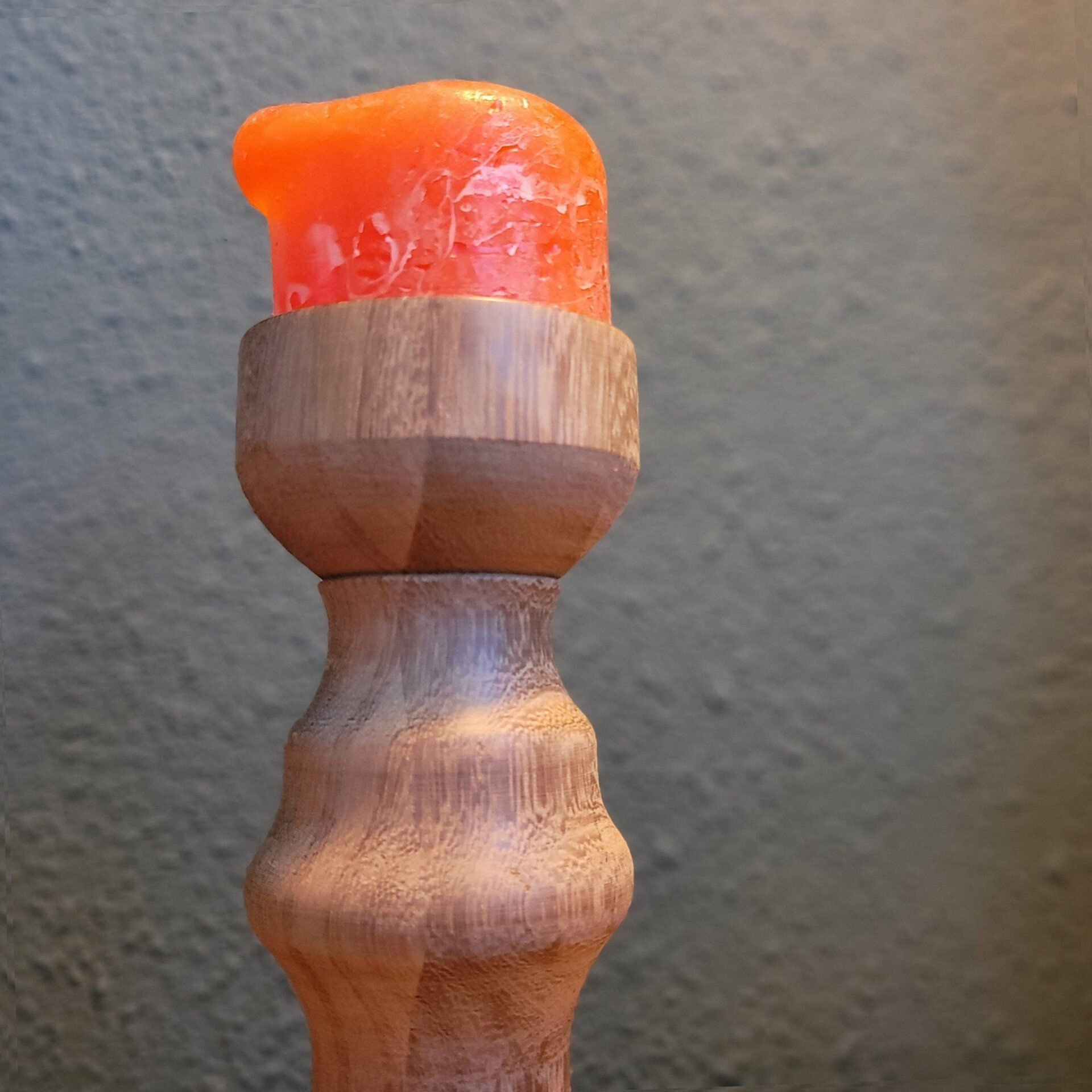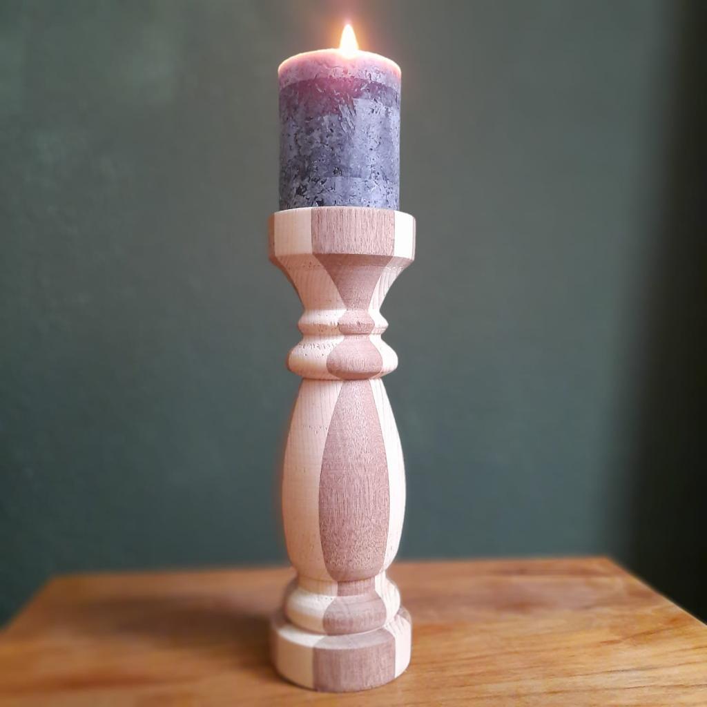 Deze houten kaarsenstandaards zijn verkrijgbaar in alle vormen en maten. Zelf vind ik het leuk om het hout eerst te verlijmen, dat houdt in dat er verschillende stukken hout aan elkaar worden gelijmd. Dat kunnen diverse soorten hout zijn waardoor er na het draaien van de standaard kleurrijke motieven zichtbaar zijn.